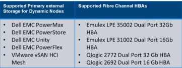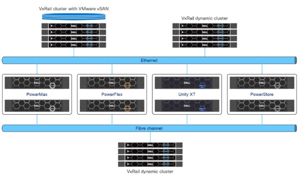 Compute kaynak ihtiyaçları ile depolama kapasite ihtiyaçlarının asimetric olarak ilerlediği ortamlar için VxRail Dynamic Nodes, Dell EMC harici storageleri birinci depolama olarak kullanabilmesini ve bağlanmasını sağlar. VxRail Dynamic Nodes, compute ve storage alanları birbirinden ayırır diyebiliriz. Compute ihtiyaçı arttırkça müşteriler site içerisine Node ekleyebilirler, Depolama talebi artıkça harici storage ekleyebilirler.