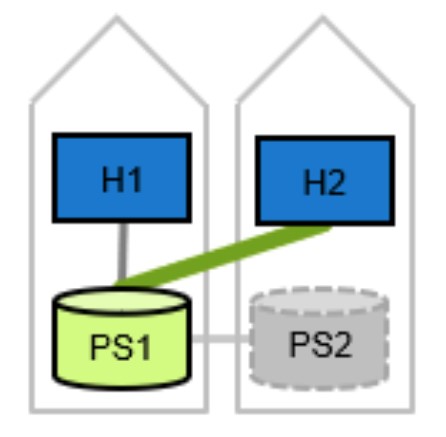 Yerel bağlantı yapılandırması, host ve uygulamaların bu depolama sistemindeki standart volumelere ve yalnızca Metro Volume’a erişimini sağlar. Bu yapılandırma, standart volumeler ve PowerStore üzerindeki Metro Volume’ler için, non-uniform (tek tip olmayan) host yapılandırmalarında kullanılır. Aşağıdaki örnekte, host H1’in non-uniform host yapılandırmasında PowerStore kümesi PS1’e bağlı olduğu gösterilmektedir.