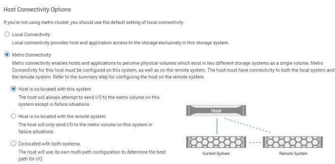 Bu kadar bilgilendirme yazısından sonra kurulum adımlarına da geçebiliriz. Öncelikle, Host Connectivity bağlantımızın nasıl olacağını ve nasıl bir sürdürülebilirlik yöntemi seçeceğimizi belirlememiz gerekmektedir. Benim ortamımda iki PowerStore sistemi aynı lokasyonda yer almaktadır. İş sürekliliğini değerlendirerek, Host is Co-located with Both Systems seçeneğini kullanacağım. Bu yapılandırma, her iki PowerStore kümesine optimize edilmiş yollar sunar ve her iki sistem de aynı veri merkezinde bulunduğu için, gecikme süresi minimuma indirilir.