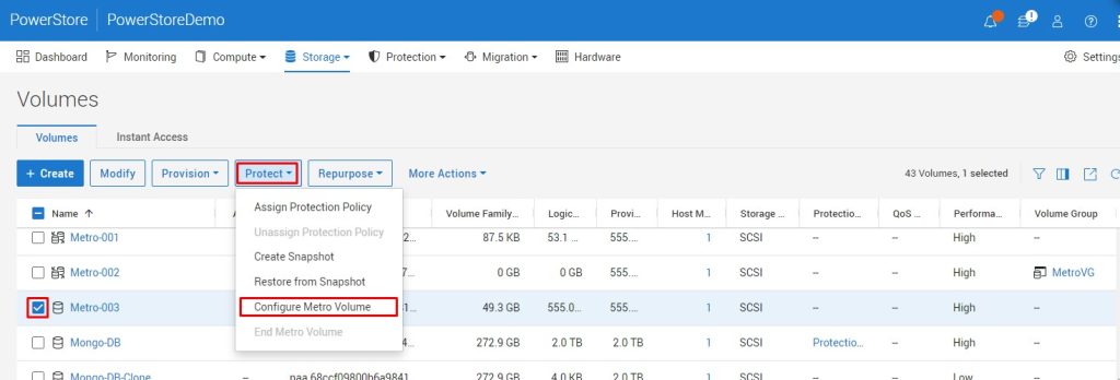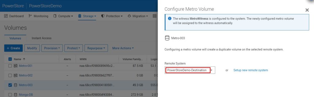 Bu volume’ü Metro Volume olarak yapılandıracağız. Öncelikle volume’ü seçiyoruz, ardından Protect menüsünden Configure Metro Volume seçeneğine tıklıyoruz. Son olarak, eşitleme yapacağımız PowerStore cihazını seçiyoruz.