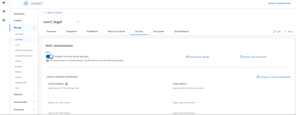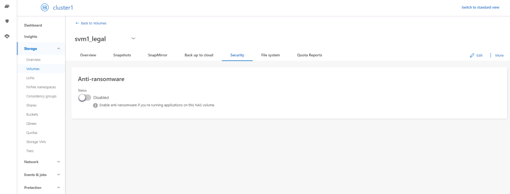 After selecting the volume in the NetApp interface and navigating to the Security tab, it can be seen that the anti-ransomware feature is disabled.