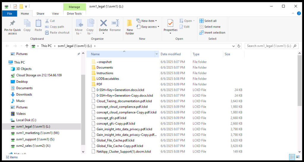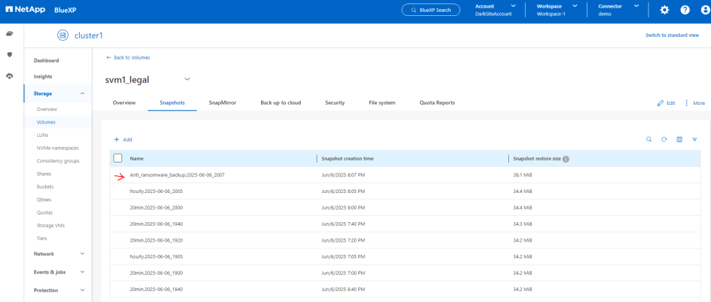 We observe that the system has created a snapshot named ‘Anti_ransomware_backup.2025-06-06_2007’ and that the related files have been encrypted.