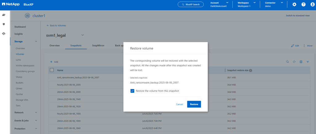 When a potential attack is suspected, the system immediately takes a volume snapshot and locks this copy. If the attack is later confirmed, the volume can be restored using the ARP snapshot. Locked snapshots cannot be deleted through normal methods. However, if you later decide to mark the attack as a false positive, the locked copy is deleted.